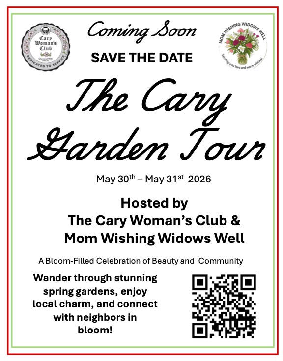 The Cary Woman’s Club partner for The Cary Garden Tour shown below, Mom Wishing Widows Well, invites you to a Kendra Scott Give Back Event on Saturday, May 9. For more details, please see HERE.–