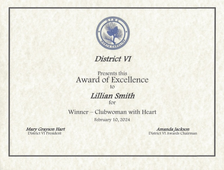- 2019 – GFWC-NC Roll of Honor Club